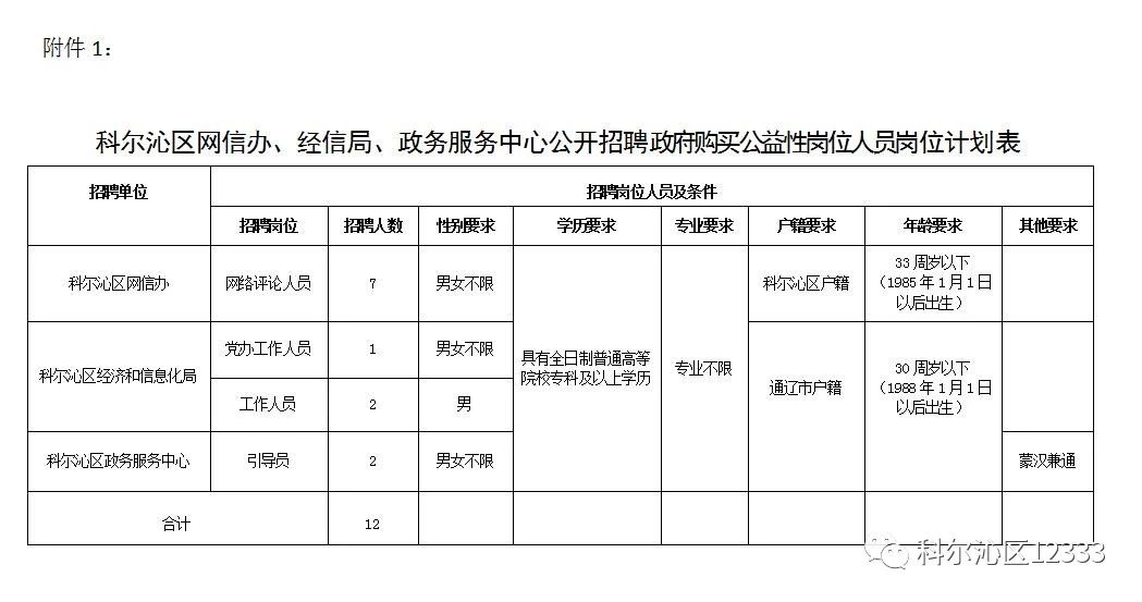 計劃招聘工作人員共計12名。具體招聘計劃及相關(guān)要求詳見《科爾沁區(qū)網(wǎng)信辦、經(jīng)信局、政務服務中心公開招聘政府購買公益性崗位人員崗位計劃表》(附件1)。