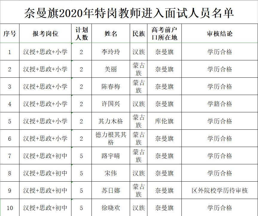根據自治區(qū)教育廳、財政廳、人力資源和社會保障廳、編辦《關于做好2020年內蒙古自治區(qū)農村牧區(qū)義務教育階段學校教師特設崗位計劃實施工作通知》(內教教師字[2020]24號)文件有關要求,現(xiàn)將奈曼旗2020年實施農村義務教育階段學校特設崗位計劃招聘資格復審及面試招聘事宜公告如下: