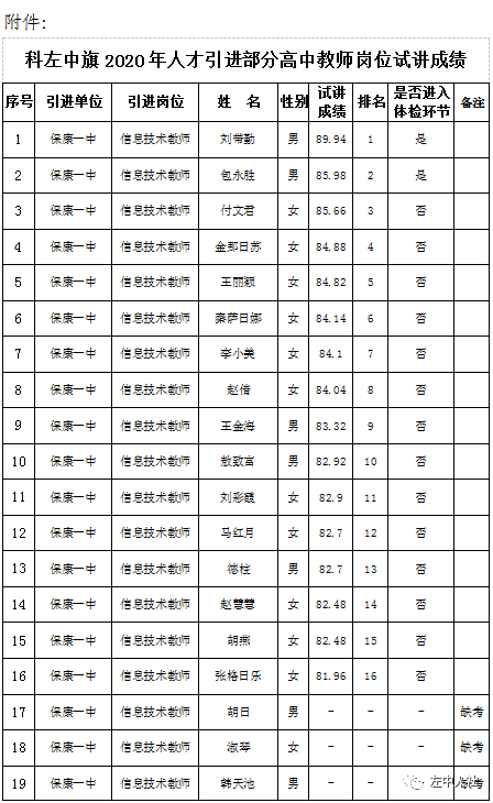 一、科左中旗2020年人才引進(jìn)部分高中教師崗位試講成績(見附件)