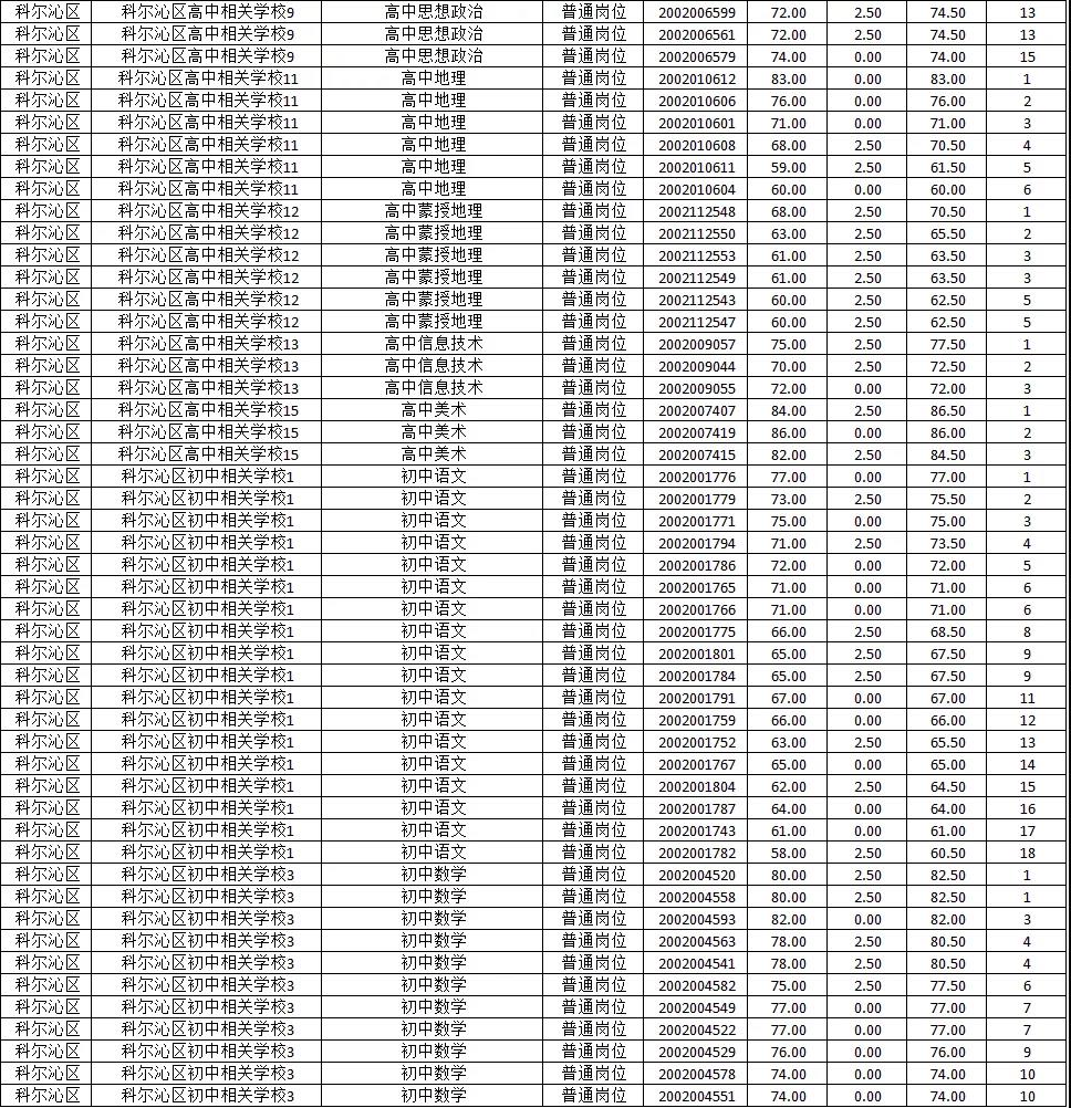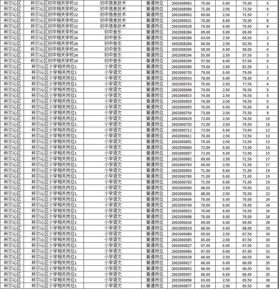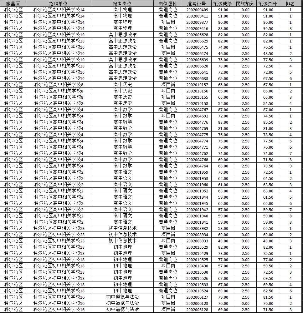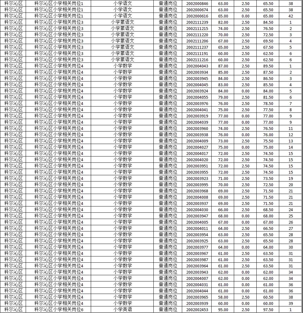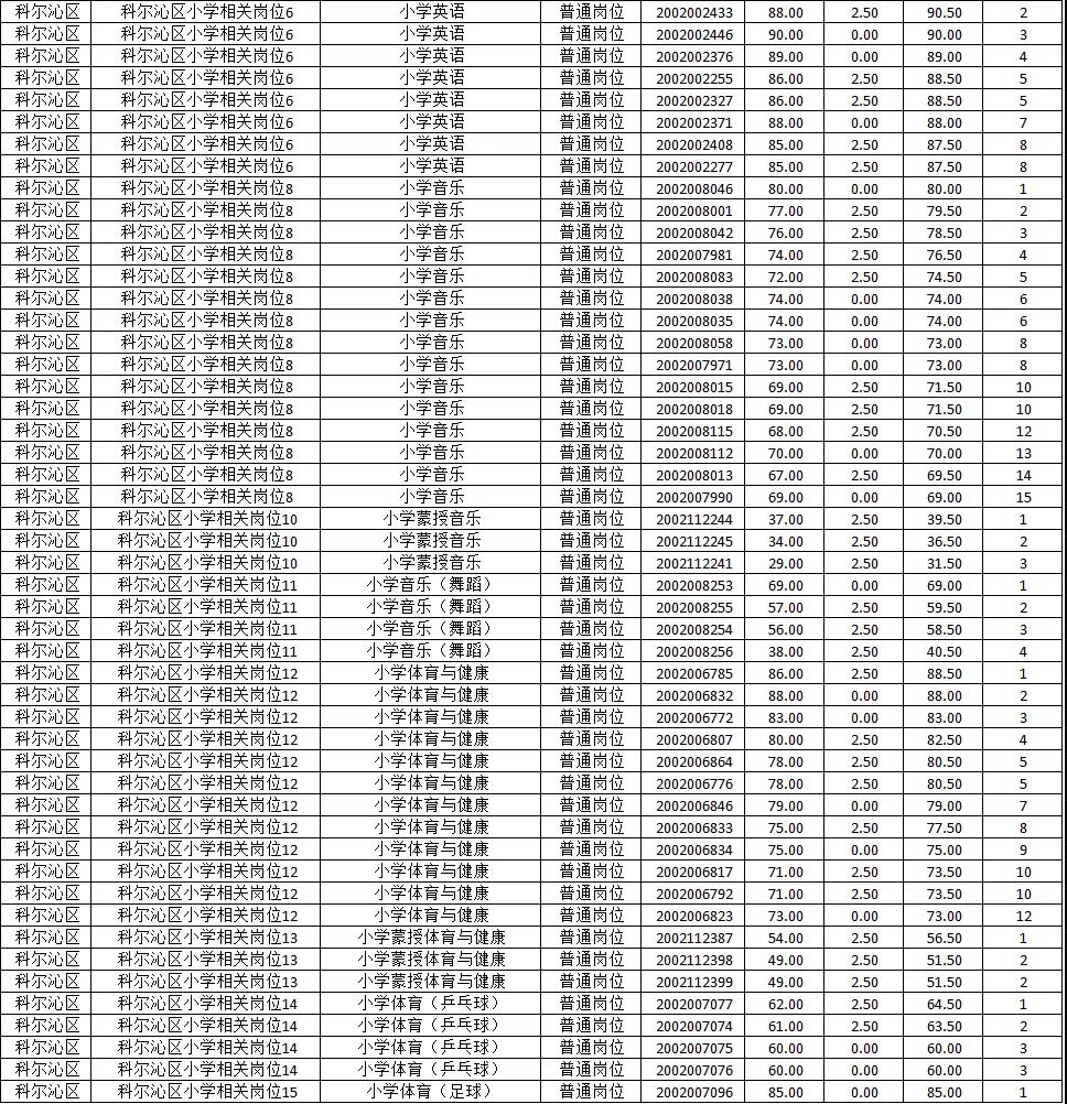 2.有效期內(nèi)二代身份證、戶口簿原件及復(fù)印件(報(bào)名與參加筆試、面試所使用的證件必須一致)。3.畢業(yè)證、學(xué)位證原件和復(fù)印件、在有效期內(nèi)的中國高等教育學(xué)生信息網(wǎng)(http://www.chsi.com.cn)上打印的學(xué)歷認(rèn)證(教育部學(xué)歷證書電子注冊(cè)備案表),國外學(xué)歷應(yīng)聘人員須持教育部學(xué)歷認(rèn)證報(bào)告。5.報(bào)考“項(xiàng)目人員”崗位的應(yīng)聘人員,須提供服務(wù)項(xiàng)目證書原件和復(fù)印件或服務(wù)地旗縣級(jí)以上主管部門出具的服務(wù)期滿(或服務(wù)起始終止日期)、考核合格(或考核初步意見)的證明原件及復(fù)印件;大學(xué)生退役士兵須提供士兵退役證原件和復(fù)印件;續(xù)聘的農(nóng)村牧區(qū)科技服務(wù)員須提供續(xù)聘合同或旗縣人社部門出具的相關(guān)證明材料。6.應(yīng)聘人員屬于行政單位、事業(yè)單位、企業(yè)職工并簽有勞動(dòng)合同的,須提交本人所在單位同意報(bào)考的證明及聯(lián)系電話。7.應(yīng)聘人員屬于機(jī)關(guān)事業(yè)單位正式在編工作人員的,須提交本人所在單位同意報(bào)考的證明及單位聯(lián)系電話。8.應(yīng)聘小學(xué)體育(乒乓球)、小學(xué)體育(足球)崗位的人員,須提交本人高校畢業(yè)成績單復(fù)印件,并加蓋檔案存放部門的公章。1.應(yīng)聘人員未在規(guī)定時(shí)間內(nèi)參加資格復(fù)審的,取消面試資格。2.資格復(fù)審重點(diǎn)審核考生所填報(bào)的信息是否真實(shí)準(zhǔn)確,凡所填報(bào)信息與所持證件不符、不符合崗位要求的報(bào)考條件、弄虛作假、因個(gè)人原因錯(cuò)填民族信息導(dǎo)致加分、隱瞞普通全日制教育在讀大學(xué)生或研究生、現(xiàn)役軍人等信息的,一律取消面試資格。3.對(duì)資格復(fù)審后出現(xiàn)缺額的崗位,按照筆試成績從高分到低分的順序依次遞補(bǔ)(分?jǐn)?shù)并列的一并進(jìn)入),將電話通知遞補(bǔ)的應(yīng)聘人員參加資格復(fù)審,應(yīng)聘人員報(bào)名時(shí)填寫的電話關(guān)機(jī)或無法接通的,責(zé)任自負(fù)。4.資格復(fù)審人員14日內(nèi)具有疫情中高風(fēng)險(xiǎn)地區(qū)旅居史或出現(xiàn)發(fā)熱、乏力、咳嗽、呼吸困難、腹瀉等病狀,務(wù)必主動(dòng)告知工作人員,并提供7日內(nèi)核酸檢測陰性證明,對(duì)于刻意隱瞞病情或者不如實(shí)報(bào)告發(fā)病史、旅居史和接觸史的人員,將按照有關(guān)法律法規(guī)予以處理。附件:科爾沁區(qū)相關(guān)崗位入圍資格復(fù)審人員名單科爾沁區(qū)相關(guān)崗位入圍資格復(fù)審人員名單