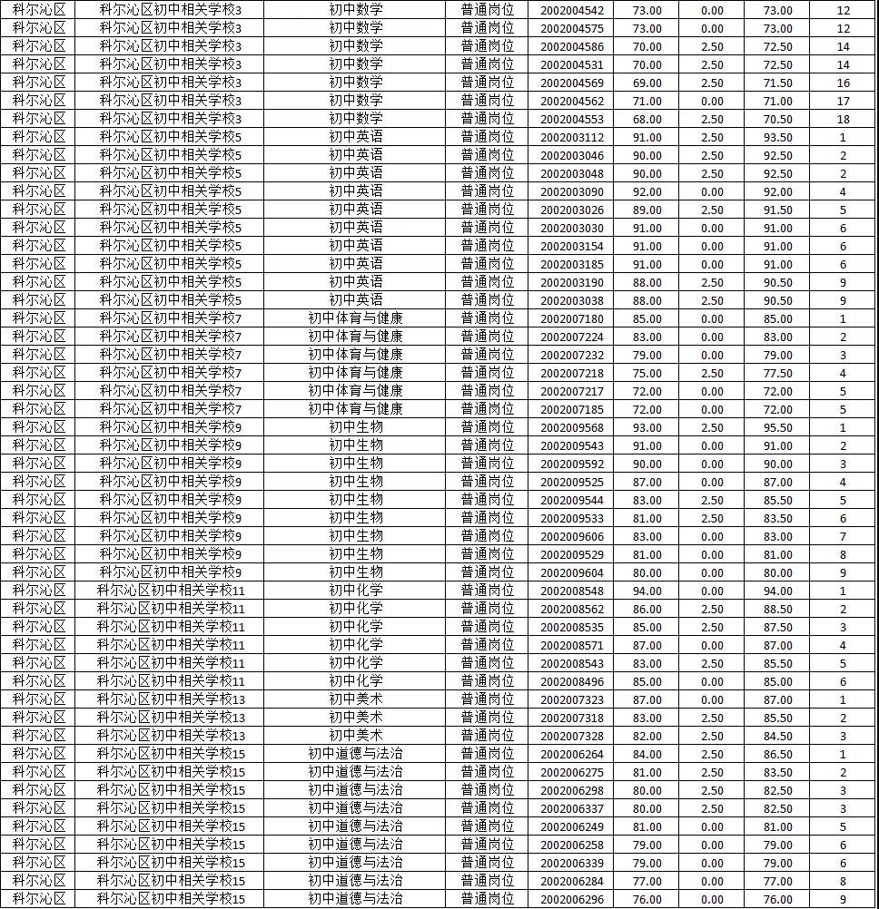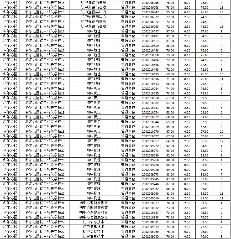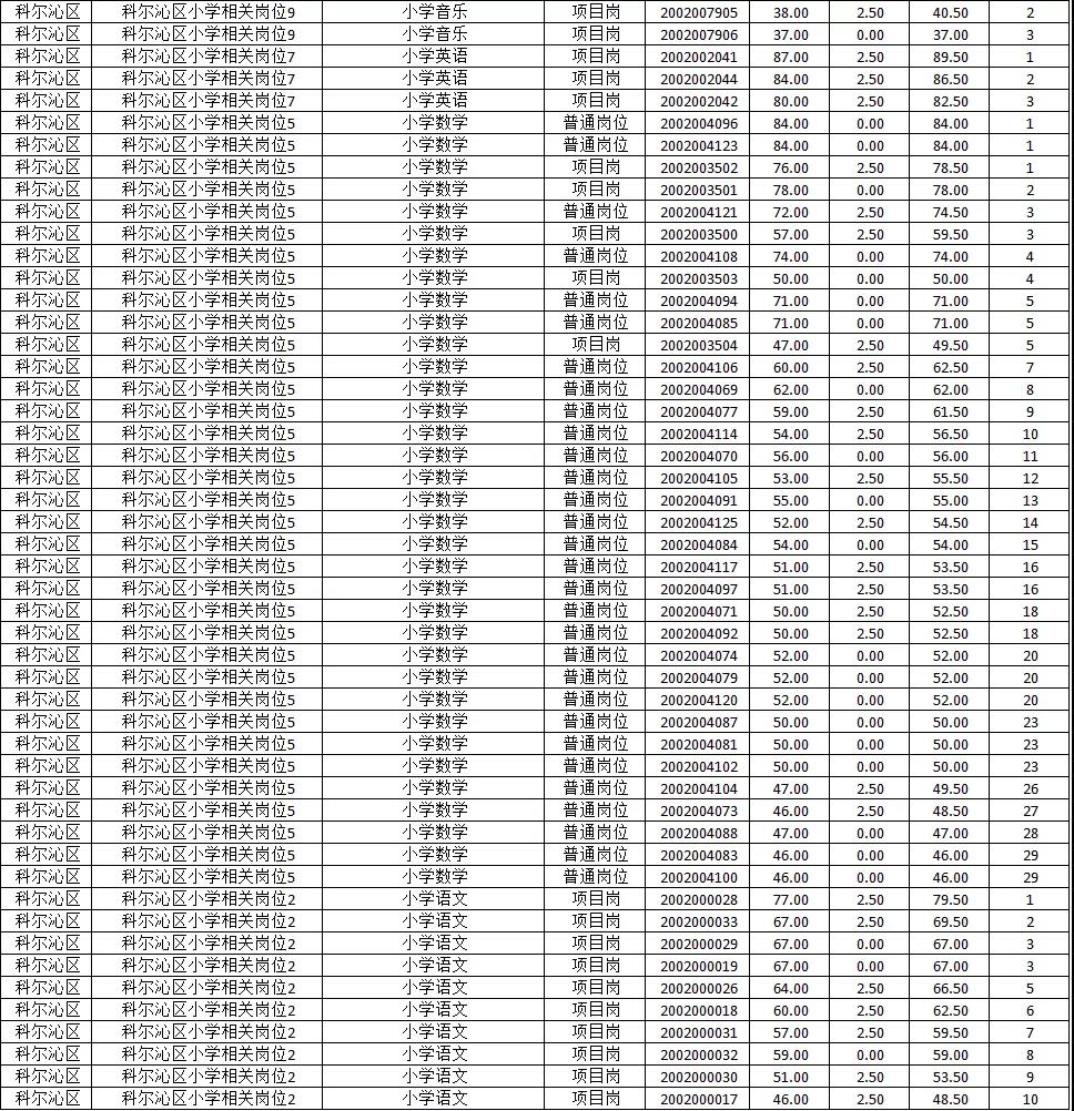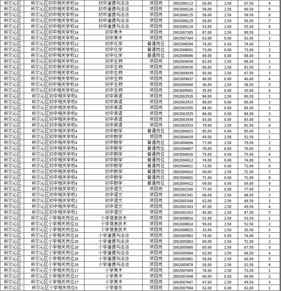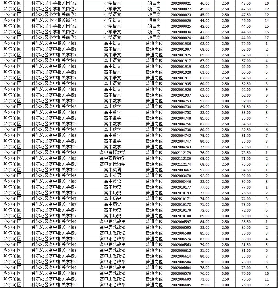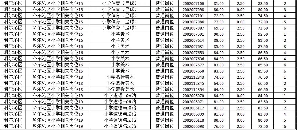 2.有效期內(nèi)二代身份證、戶口簿原件及復(fù)印件(報(bào)名與參加筆試、面試所使用的證件必須一致)。3.畢業(yè)證、學(xué)位證原件和復(fù)印件、在有效期內(nèi)的中國高等教育學(xué)生信息網(wǎng)(http://www.chsi.com.cn)上打印的學(xué)歷認(rèn)證(教育部學(xué)歷證書電子注冊(cè)備案表),國外學(xué)歷應(yīng)聘人員須持教育部學(xué)歷認(rèn)證報(bào)告。5.報(bào)考“項(xiàng)目人員”崗位的應(yīng)聘人員,須提供服務(wù)項(xiàng)目證書原件和復(fù)印件或服務(wù)地旗縣級(jí)以上主管部門出具的服務(wù)期滿(或服務(wù)起始終止日期)、考核合格(或考核初步意見)的證明原件及復(fù)印件;大學(xué)生退役士兵須提供士兵退役證原件和復(fù)印件;續(xù)聘的農(nóng)村牧區(qū)科技服務(wù)員須提供續(xù)聘合同或旗縣人社部門出具的相關(guān)證明材料。6.應(yīng)聘人員屬于行政單位、事業(yè)單位、企業(yè)職工并簽有勞動(dòng)合同的,須提交本人所在單位同意報(bào)考的證明及聯(lián)系電話。7.應(yīng)聘人員屬于機(jī)關(guān)事業(yè)單位正式在編工作人員的,須提交本人所在單位同意報(bào)考的證明及單位聯(lián)系電話。8.應(yīng)聘小學(xué)體育(乒乓球)、小學(xué)體育(足球)崗位的人員,須提交本人高校畢業(yè)成績單復(fù)印件,并加蓋檔案存放部門的公章。1.應(yīng)聘人員未在規(guī)定時(shí)間內(nèi)參加資格復(fù)審的,取消面試資格。2.資格復(fù)審重點(diǎn)審核考生所填報(bào)的信息是否真實(shí)準(zhǔn)確,凡所填報(bào)信息與所持證件不符、不符合崗位要求的報(bào)考條件、弄虛作假、因個(gè)人原因錯(cuò)填民族信息導(dǎo)致加分、隱瞞普通全日制教育在讀大學(xué)生或研究生、現(xiàn)役軍人等信息的,一律取消面試資格。3.對(duì)資格復(fù)審后出現(xiàn)缺額的崗位,按照筆試成績從高分到低分的順序依次遞補(bǔ)(分?jǐn)?shù)并列的一并進(jìn)入),將電話通知遞補(bǔ)的應(yīng)聘人員參加資格復(fù)審,應(yīng)聘人員報(bào)名時(shí)填寫的電話關(guān)機(jī)或無法接通的,責(zé)任自負(fù)。4.資格復(fù)審人員14日內(nèi)具有疫情中高風(fēng)險(xiǎn)地區(qū)旅居史或出現(xiàn)發(fā)熱、乏力、咳嗽、呼吸困難、腹瀉等病狀,務(wù)必主動(dòng)告知工作人員,并提供7日內(nèi)核酸檢測陰性證明,對(duì)于刻意隱瞞病情或者不如實(shí)報(bào)告發(fā)病史、旅居史和接觸史的人員,將按照有關(guān)法律法規(guī)予以處理。附件:科爾沁區(qū)相關(guān)崗位入圍資格復(fù)審人員名單科爾沁區(qū)相關(guān)崗位入圍資格復(fù)審人員名單