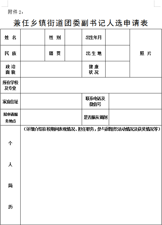 (1)報(bào)名人員需自行下載打印并填寫《兼任鄉(xiāng)鎮(zhèn)街道團(tuán)委副書記人選申請(qǐng)表》(附件2)