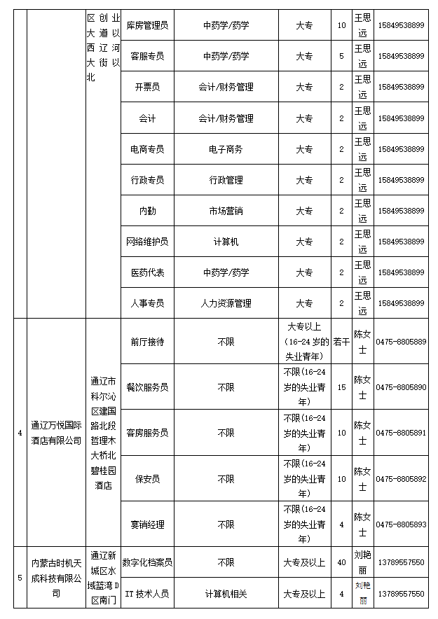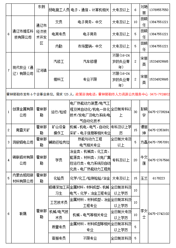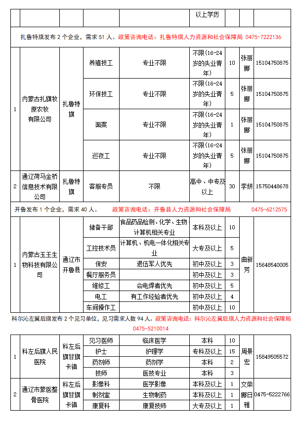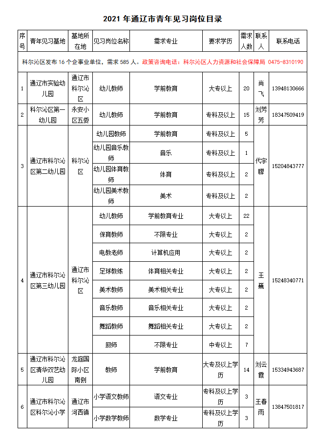 青年見習計劃是國家自治區(qū)為促進青年就業(yè)和成長發(fā)展的重要措施。為進一步幫助高校畢業(yè)生和失業(yè)青年提升就業(yè)能力,促進高質(zhì)量就業(yè),幫助實現(xiàn)見習單位和與習人員的雙向互通,按照《關(guān)于印發(fā)<內(nèi)蒙古自治區(qū)青年見習計劃實施方案>的通知》(內(nèi)人社發(fā)〔2019〕14號)要求,通遼市人力資源和社會保障局廣泛征集青年見習崗位需求信息,編制了《2021年通遼市青年見習崗位需求目錄》,共38家企事業(yè)單位,提供見習崗位202個,招募見習人員1376人,現(xiàn)予發(fā)布。請廣大離校2年內(nèi)未就業(yè)高校畢業(yè)生和16-24歲失業(yè)青年踴躍參與,選擇合適崗位進行見習。政策咨詢電話詳見附件。