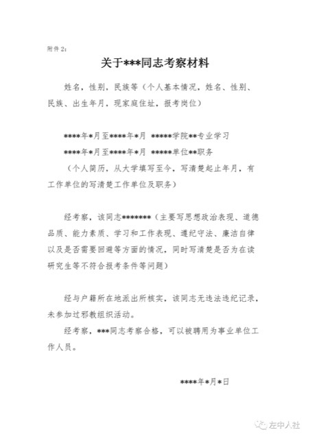 1.科左中旗事業(yè)單位新聘用人員政審表一份,須所在單位、村(居)委會(huì)和戶籍所在地派出所出具意見并簽字蓋章(模板見附件1);
