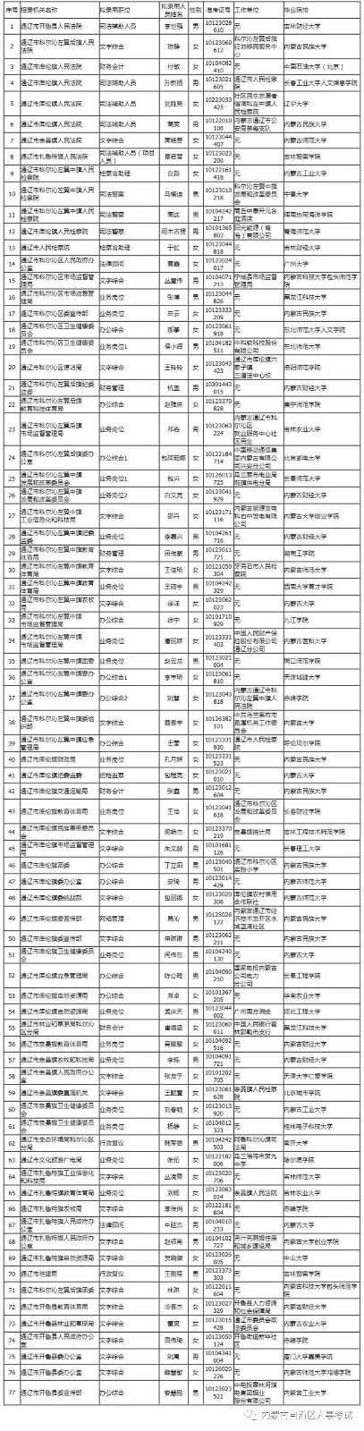 根據(jù)《內(nèi)蒙古自治區(qū)黨政群機(jī)關(guān)(參公單位)2020年考試錄用公務(wù)員(參公單位)簡(jiǎn)章》及有關(guān)規(guī)定、考生考試總成績(jī)以及體檢考察結(jié)果,現(xiàn)對(duì)通遼市擬錄用人員予以公示。