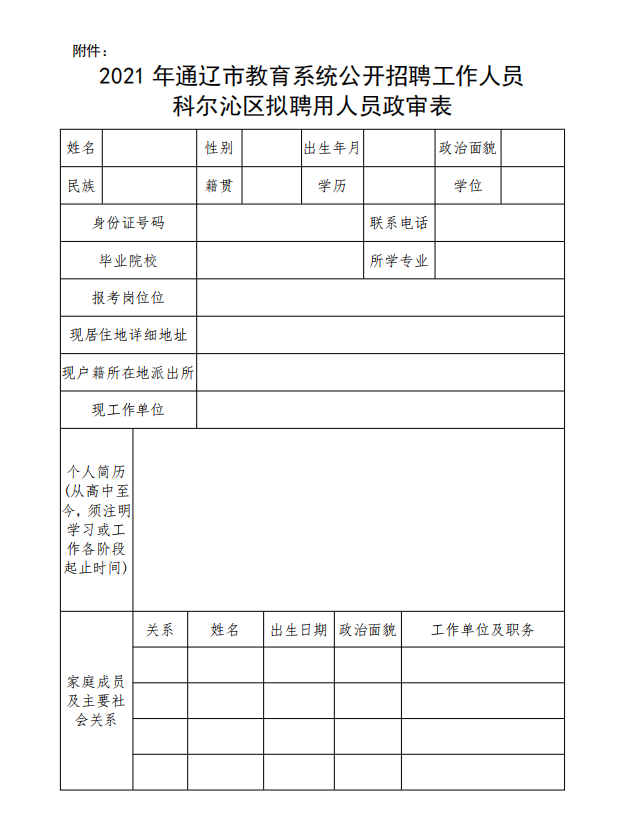 1.在職人員提供《干部人事檔案》,無(wú)業(yè)人員提供《學(xué)籍檔案》。3.居住地所在社區(qū)(村委會(huì))和戶籍所在地或居住地轄區(qū)派出所出具的無(wú)違法違紀(jì)證明材料,需下載附件《政審表》(此表正反面打?。鼍卟块T填寫意見(jiàn)并簽字蓋章。4.提供中國(guó)人民銀行出具的《個(gè)人征信報(bào)告》。5.憑所在院系出具的證明參加資格審核的2021年應(yīng)屆高校畢業(yè)生,須提供畢業(yè)證、學(xué)位證、教師資格證原件及復(fù)印件。6.《教師資格認(rèn)定申請(qǐng)表》原件。1.考察組審核擬聘用人員提供的學(xué)籍檔案(或人事檔案)及相關(guān)證件,了解被考核對(duì)象報(bào)名以來(lái)所提供的各類證件、經(jīng)歷是否真實(shí)有效、符合崗位要求。2.通過(guò)《政審表》《個(gè)人征信報(bào)告》了解其學(xué)習(xí)工作表現(xiàn)和遵紀(jì)守法等方面的實(shí)際情況。1.考察工作須本人攜帶相關(guān)材料到考察地點(diǎn)現(xiàn)場(chǎng)進(jìn)行,未在指定日期內(nèi)提交考察材料,視為自動(dòng)放棄錄用。2.需要給檔案存放部門致函提取檔案的人員,本人可在8月2日至4日工作時(shí)間內(nèi)持有效二代身份證到區(qū)教體局401辦公室,可配合出具借(調(diào))檔函。附件:2021年通遼市教育系統(tǒng)公開(kāi)招聘工作人員科爾沁區(qū)相關(guān)崗位政審表