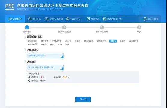 2.然后在上方的盟市考點(diǎn)選項(xiàng)中點(diǎn)擊“通遼市”,選擇“內(nèi)蒙古通遼市測試站”,點(diǎn)擊“下一步”