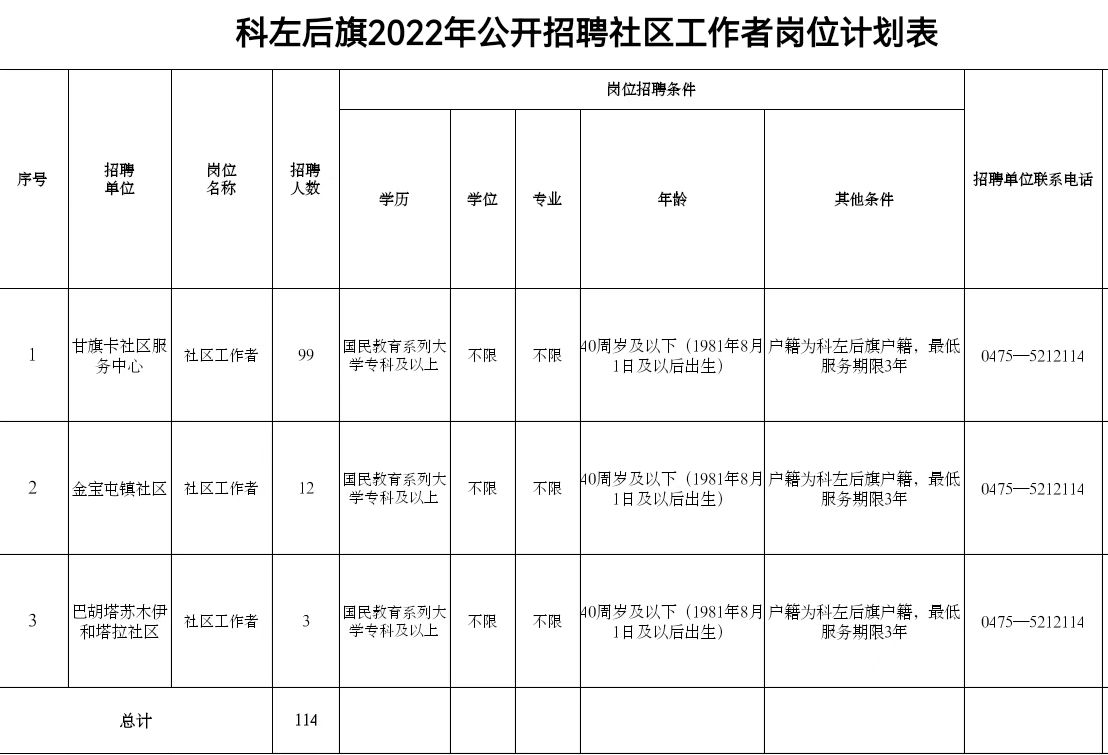 計劃招聘社區(qū)工作者114名。其中,甘旗卡社區(qū)服務(wù)中心99人、金寶屯鎮(zhèn)社區(qū)12人,巴胡塔蘇木伊和塔拉社區(qū)3人。詳見《科左后旗2022年公開招聘社區(qū)工作者崗位計劃表》。