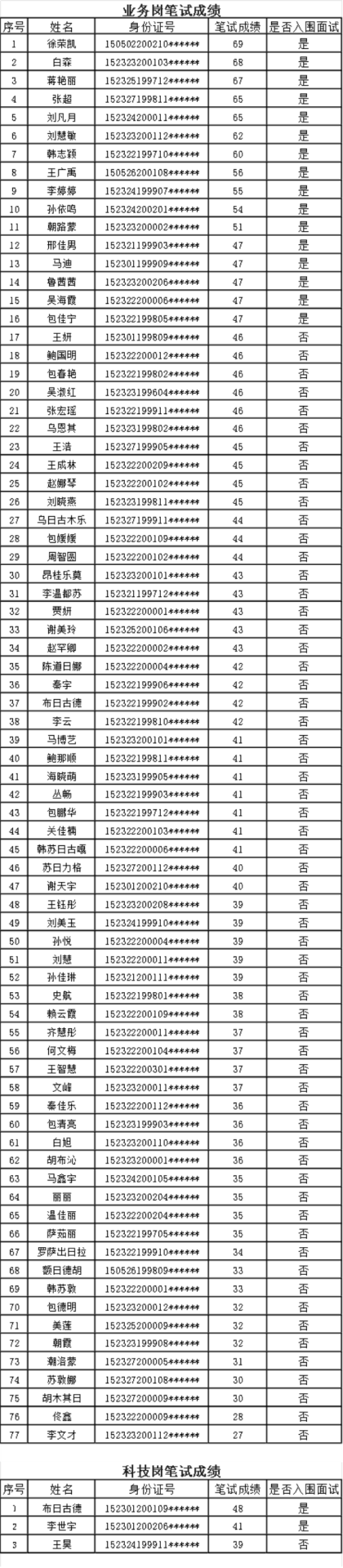 根據(jù)《科爾沁左翼中旗農(nóng)村信用合作聯(lián)社2023年校園招聘工作方案》要求,2023年校園招聘筆試現(xiàn)已經(jīng)結(jié)束,依據(jù)招聘崗位成績各自排名,按照1:2比例,共有18名考生進(jìn)入后續(xù)面試環(huán)節(jié)?,F(xiàn)將筆試成績公告如下: