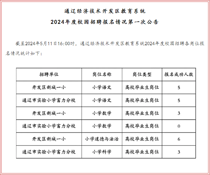 截至2024年5月11日16:00時(shí),通遼經(jīng)濟(jì)技術(shù)開發(fā)區(qū)教育系統(tǒng)2024年度校園招聘各崗位報(bào)名情況統(tǒng)計(jì)如下: